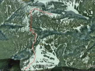 The skies were clear and the moon was near full, which made the forest and snow appear softly lit. We followed the “Snowshoe Grind” through the ski hill and to the turnoff for the Alpine Trail. The trail was well worn – snowshoes were not needed, but microspikes were very useful. Similarly, the Alpine Trail was well-trodden through the ~30-40cm of snow.