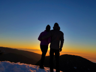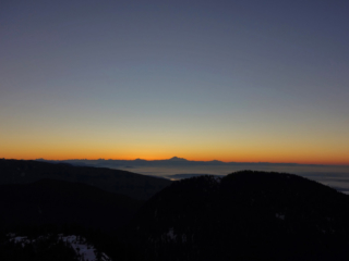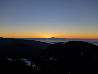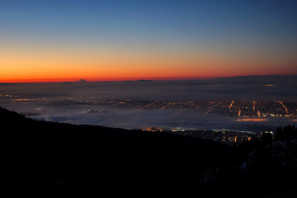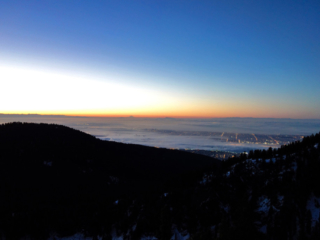 Ryan and I attended the annual North Shore Rescue Christmas party at Grouse Mountain’s Altitudes Bistro on Saturday evening. With the great weather forecast (clear skies and a temperature inversion), we took advantage of our starting position; after the party, we grabbed our packs and hiked out to Thunderbird Ridge for a winter camp and sunrise.