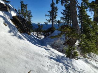 We reached the turnoff for Thunderbird Ridge; we were happy to see there was also a distinct trail through the snow. We dropped some elevation onto the ridge and gained it back as we continued along.